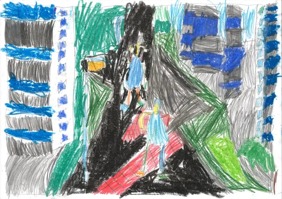 На моем рисунке нарисован центр нашего района - Строгинский бульвар, и гуляющие по нему люди. Я с родителями там тоже часто гуляю. Мне нравиться мой район!