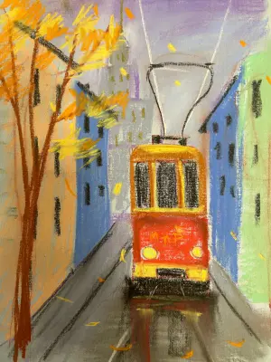Мне очень нравится гулять по центру, там тихо и как будто попадаешь в другой мир, поэтому я решил нарисовать улицу Москвы, где ходят старые трамваи, почти нет людей и машин. Моя работа нарисована в технике сухая пастель.