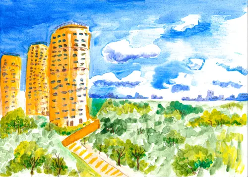 Я нарисовала летнее утро в Строгино. Лёгкие и пушистые облака плывут по голубому небу над яркой зеленью деревьев и кустарников, над красивыми башнями жилых домов. А вдалеке за рекой виден район Щукино.