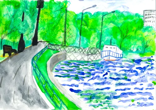 У нас в районе есть очень красивое место - набережная в Троице-Лыково. Его-то я и нарисовала. Берег Москвы-реки с фонарями и скамейками, а у причала - белый прогулочный теплоход.