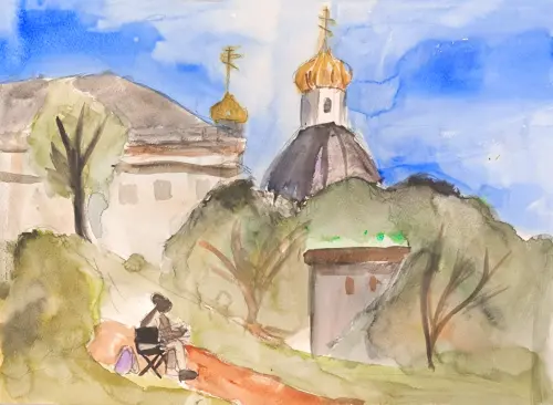 На картине изображен солнечный, тихий городок. Ярко-зеленые деревья отбрасывают тени на уютные дома. Центральное место занимает белая церковь с колокольней. Перед ней, в тени деревьев, сидит художник с мольбертом. Он внимательно рисует этот мирный пейзаж, залитый теплым светом. Картина передает спокойствие летнего дня и красоту привычных городских уголков.