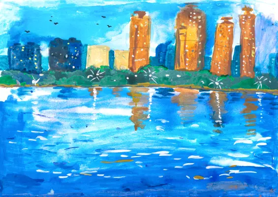 Мой район - Строгино! Он красив в любое время года! Это очень живописное место, много зелени и река с заливом! Я нарисовал вид на Строгино летом со стороны залива.