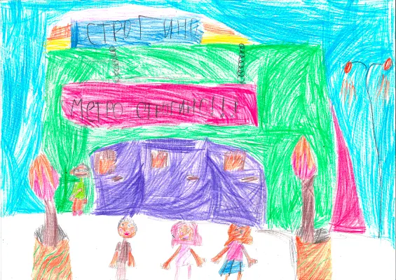 Я живу в Строгино. Мне нравится мой район, он красивый. В Строгино много всего интересного. В своем рисунке я нарисовала, как вечером люди выходят из метро.