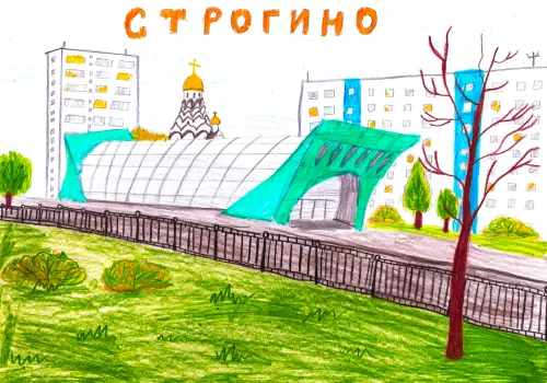 Привет! Меня зовут Дарья. Мне 10 лет. И это мой рисунок, посвященный району Строгино, а именно - метро. Я очень люблю свой район, он очень красивый и живописный.