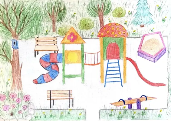 На моей работе нарисована любимая детская площадка, она очень хорошая и удобная. Я люблю веселиться на ней! Мой район благоустроенный и очень хороший!
