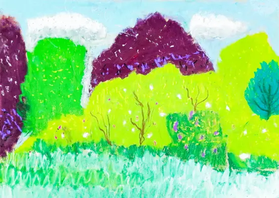 Пейзаж с цветущим шиповником и высоким тёмно-фиолетовым клёном на фоне голубого неба. Парк «Борисовские пруды» очень красив в любое время года, но особенно летом. Я часто там гуляю. В рисунке мне хотелось передать всё многообразие ярких летних цветов и оттенков. Работа выполнена на пленэре в технике масляная пастель.
