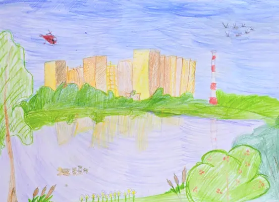 В своем рисунке я изобразил район, в котором живу - ЖК "Прима парк". Ракурс был взят со стороны Барышевского пруда на дома нашего комплекса и Котельную. Так же рядом с нашим жилым комплексом находится аэропорт "Остафьево" и часто летают пожарные вертолеты, один из которых я тоже изобразил на своем рисунке.