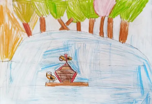Мы любим с папой ходить в парк у Дворца пионеров. Особенно на прудик. Мы запускаем здесь кораблики и смотрим на уток. Однажды мы взяли с собой на прогулку карандаши и бумагу. Я нарисовала то, что увидела перед собой в тот день, а потом показала рисунок маме.
