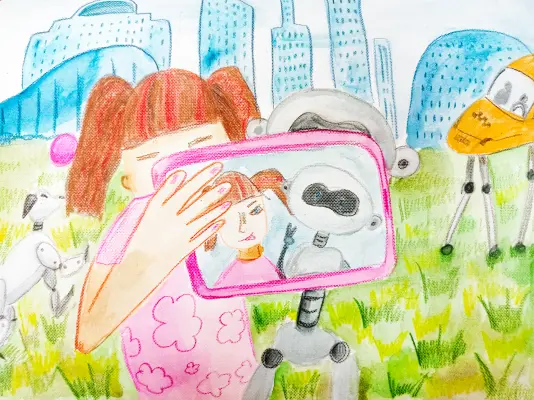 Рисовал пастелью и красками акварель. Изображены здания будущего, такси будущего, робот и собака-робот. Так я представляю свой район и свой двор в нашем будущем. Что-то из фантастики.