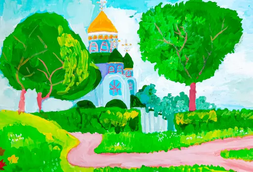 Я живу в районе Солнцево города Москвы. У нас очень зелёный район, красивые пруды, парки, скверы. Около большого пруда есть храм Сергия Радонежского. Его я и изобразила на своём пейзаже. Приезжайте в гости в мой любимый район!