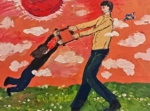 Это был прекрасный летний вечер, мы гуляли с папой на площадке у библиотеки и провожали закат. Всё было таким розовым! Это и вдохновило меня на рисунок