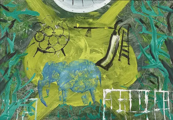 "Слон на Семёновской", 42х29 см. На рисунке «Слон на Семеновской» изображён слон, стоящий на улице Семёновской. Фон – городская среда: здания, деревья. я постарался передать мирное настроение городского пейзажа.