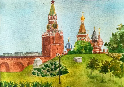 «Москва... как много в этом звуке для сердца русского слилось!» Этими словами Пушкин показывает особое отношение любого русского человека к Москве. Москва является не просто городом, она – как центр Вселенной. А центр – это сердце, которое дает жизнь и, в то же время, эмоции. Поэтому я решила изобразить Кремль и передать не только его архитектурный стиль, но и попробовать раскрыть с помощью рисунка эмоции, которые Кремль, как сердце Москвы, вызывает у любого человека, оказавшегося у его стен. Посмотрите, как он прекрасен в лучах солнца. Это – сердце моей Столицы! И я живу в ней! Это – моя Родина! Я хочу, чтобы вы, люди, которые смотрите на мой рисунок, испытали такие же чувства, увидели красоту и ощутили особенность этого места.