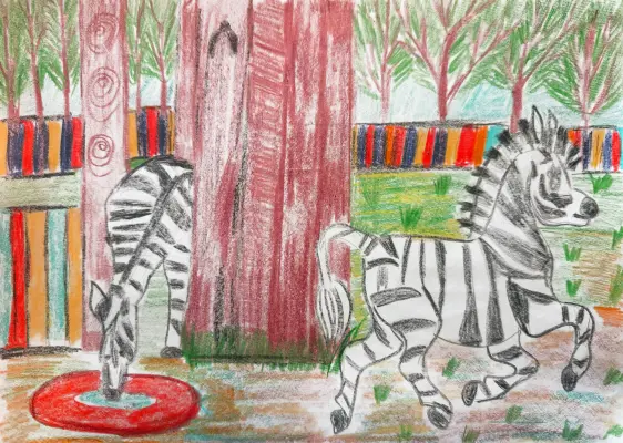 Мы любим смотреть, как гуляют зебры в московском зоопарке. Они вышагивают по траве. Любят, когда их кормят работники. Мы смотрим и машем им рукой .