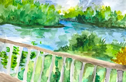 Я нарисовала эту картину этим летом, когда гуляла в парке Крылатские холмы. Мне очень понравилось место с видом на реку — деревянная площадка с перилами, вокруг всё было зелёное и спокойное. Захотелось это исправить. У меня с собой был скетчбук и акварель, и прямо там начала рисовать. Я сделала мазки мягкими и слегка размытыми, чтобы передать ощущение свежести и тишины. Было рано, людей почти не было, воздух казался влажным и прохладным. Листья внизу блестели от росы. Вода отражала небо, деревья и даже настроение, казалось, это был живой разговор. Свет пробивался сквозь верхушки листвы — я постаралась передать это светлое пятно, будто утро вот-вот начнётся. Кустик справа я сделала жёлтым — он выделился, и мне захотелось добавить яркости. Перила получились немного кривоватыми, но мне даже нравится — это делает картину живой. Она не идеальна, но настоящая. Эта работа — не просто пейзаж, а воспоминание о лете, покое и тех чувствах, когда тебе хорошо, и хочется сохранить это в памяти.
