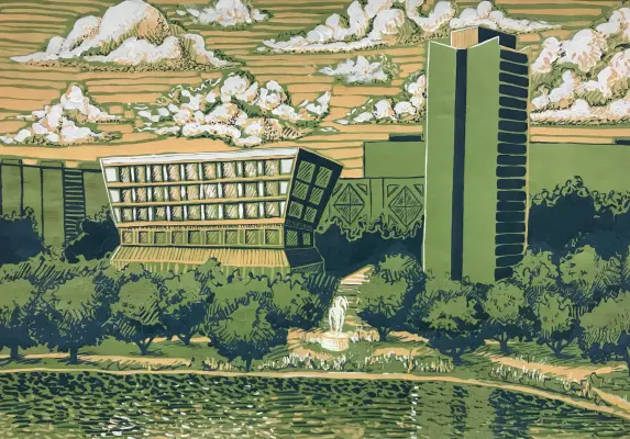 Живописная работа выполнена в технике гуашь на тонированной бумаге. На работе изображен Парк Победы, здание префектуры Зеленограда и здание бизнес-центра.