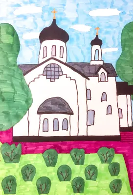 Работа выполнена на бумаге формата а3. Использовались простой карандаш и фломастеры. Храм Новомучеников Подольских находится на территории посёлка Шишкин Лес. В храме есть воскресная школа.