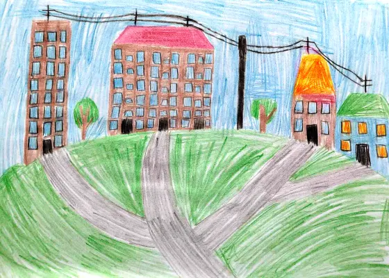 На моем рисунке дома старой постройки соседствуют с новыми, которые по реновации.