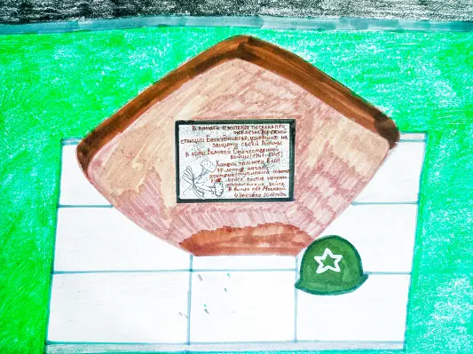 На рисунке представлен Памятный мемориал, посвящённый жителям Бескудниково. Центральным элементом композиции служит тёмный гранитный камень, на котором закреплена мемориальная доска.