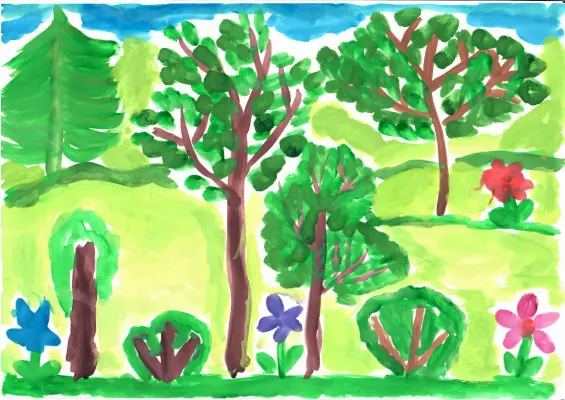 Мы живем рядом с лесом. Там много деревьев. Мы собираем там цветы и кормим белок. Зимой катаемся с горок на санках. В лес мы ходим всей семьей и берем с собой нашу собаку Рекса.