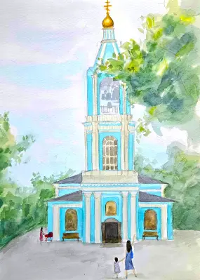 Я нарисовала наш храм, потому что он самый красивый! Его золотые купола сияют, а внутри так тихо и светло. Мама говорит, ему много лет, но он всё такой же сказочный. Мне нравится здесь гулять – будто попадаешь в добрую старинную историю. Это главное сокровище нашего Крылатского!