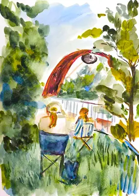 Работа выполнена в акварельной технике. На ней изображен Живописный мост, который соединяет два берега Москвы-реки и ученики, делающие его зарисовки.