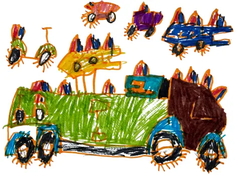 Нарисовано фломастерами на белой бумаге. Полицейских автовоз перевозит другие полицейские машины, и они из него выезжают. Машины с шипами на колесах, потому что на улице зима.