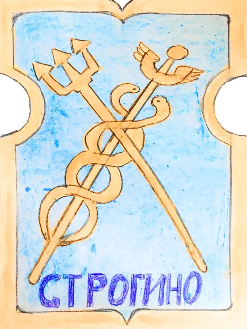 Герб района Строгино представляет собой голубой щит с узкой золотой каймой по краям, в центре которого изображены перекрещенные золотые жезл Меркурия и острога.