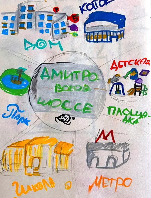 На своем рисунке я изобразила район Северный, в котором живу. И этим рисунком я хочу рассказать, какой это красивый и спокойный район. В центре находится главная улица моего района, Дмитровское шоссе, а мой двор находится на Бульваре Академика Ландау. Вокруг я нарисовала самые классные места, которые у нас есть: мой дом, детскую площадку рядом с ним, мою школу, парк усадьбы Архангельское-Тюриково с Нижним прудом, каток, станция метро Физтех и магазины, куда я с мамой и сестрой хожу за продуктами. Мне нравится наш район, потому что здесь есть всё, что нужно – и для жизни, и для учебы, и для отдыха. Особенно я люблю гулять в парке и кататься на катке зимой. Я считаю, что мой район — самый лучший!