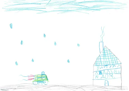 Здесь я нарисовал чувства, которые появляются, когда выходишь во двор. Это мой двор глазами мечтателя. Здесь всё привычное, но немного сказочное.
