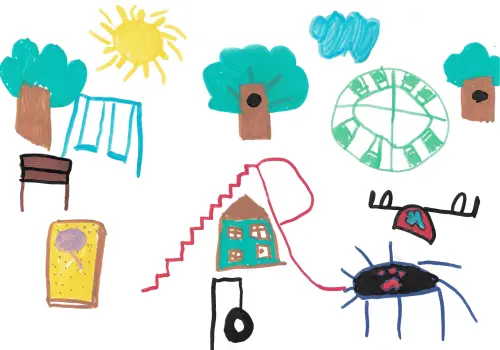 На рисунке изображены все любимые Милой элементы детской площадки: 2 вида качелей, песочница, карусель, батут, горка с домиком, где можно прятаться, и колесо, на котором можно тренироваться как на любимой гимнастике. Кроме того, конечно, вокруг много зелени - деревья помогают скрыться от палящего солнца (в одном из них дупло - для белки, которых много в нашем районе из-за близости парка Фили). А для родителей и бабушек с дедушками стоят скамейки, где они могут отдохнуть, пока Мила развлекается по-полной.