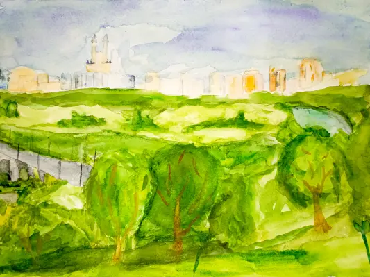 На картине изображена природная красота Крылатских холмов с тенистыми чащобами на крутых склонах, с весёлом звоном прозрачных ручьев, задорным щебетом птиц.