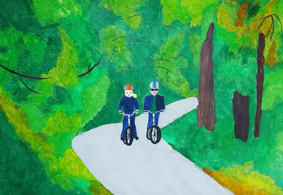 На рисунке изображен летний парк Крылатские холмы, в котором люди катаются на велосипедах в дневное время суток. Вокруг них красивые и высокие деревья.