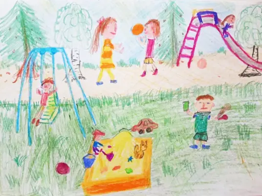 Играть во дворе - это супер здорово. Встречаемся с друзьями и играем в разные игры. Люблю кататься на качелях и с горки. Еще играем в догонялки. Но самое интересное - это прятки.