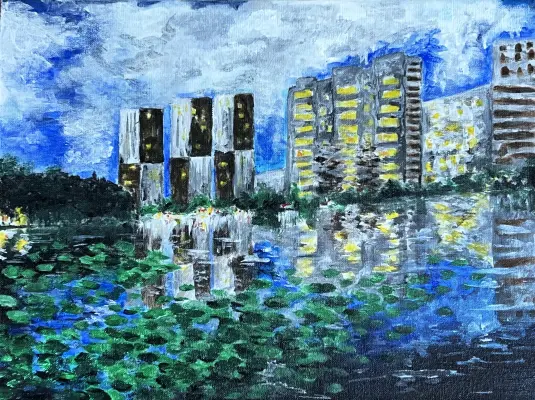 Работа выполнена акрилом на холсте формата А3 летом 2025г. Изображен актуальный вид со стороны Коломенской улицы на новый микрорайон в Нагатинском Затоне, ЮАО г. Москвы.