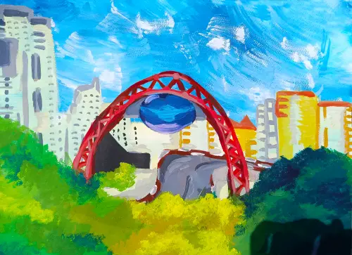Моя художественная школа находится в районе Строгино. Каждый раз, когда я еду на занятия в школу из окна вижу красивый, живописный мост. Мост очень яркий и объединяет районы Строгино и Щукино.