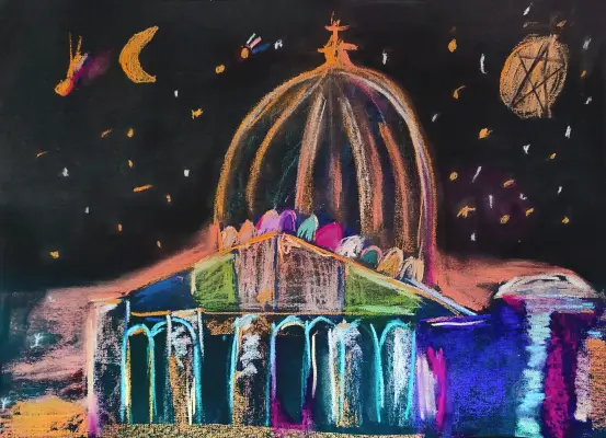 На моей картине павильон выглядит очень таинственно, по небу летит комета и видно как образовалась сверхновая звезда. Картину нарисовал пастелью на специальной бумаге. Мне нравится рисовать пастелью, потому что можно растереть мелки и создать эффект свечения.