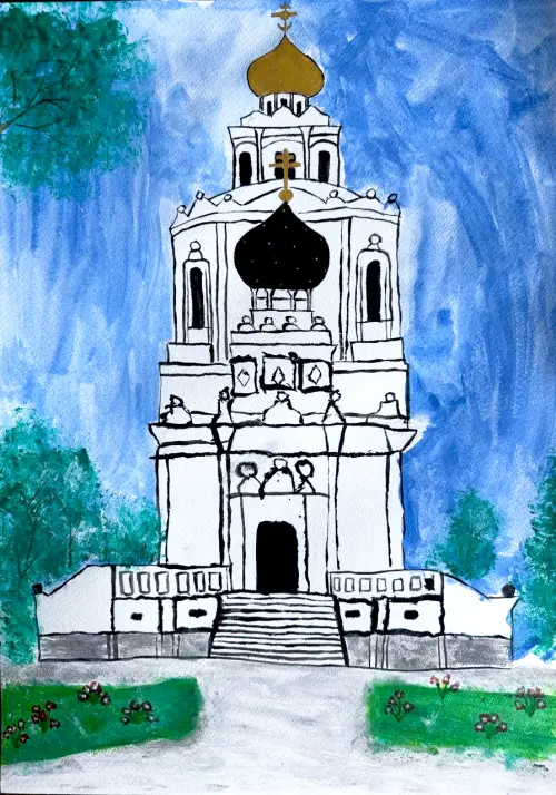 Работа нарисована акварелью. Храм Троицы Живоначальной находится в Троице - Лыково на берегу Москва - реки. Он очень красивый. Когда на него смотришь снизу - вверх, то кажется, что храм своим куполом достает до небес. И внутри он тоже красив.