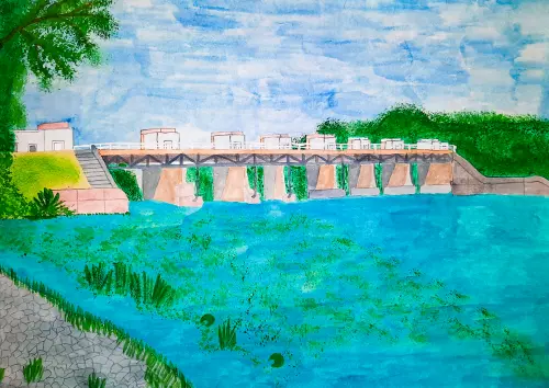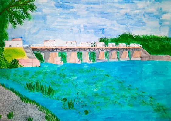 Я очень люблю свой район. Он очень зелёный и красивый. А ещё мне очень нравится наблюдать за нашей плотиной, как она регулирует уровень воды. Мы с мамой часто ходим гулять к плотине и смотреть на уток. Берег обложен камнями, и можно подойти к самой воде. На моём рисунке у плотины открыты не все заслонки, я читал, что они называются «створами».