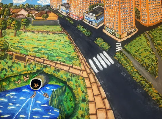 Моя работа для конкурса была написана гуашью, формат А3. Я представила на холсте свое любимое прогулочное место на районе, где люблю: мечтать у воды, кормить уток и читать книгу. Выбрала именно такой ракурс, чтобы показать ту атмосферу дружественности природы и каменных джунглей. В эту работу я вложила душу и любовь. Надеюсь, каждый из членов жюри, посмотрев на пейзаж, сможет почувствовать атмосферу летнего дня моего любимого места силы.