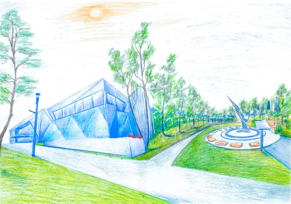 На рисунке изображен спорткомплекс с панорамными стёклами и качественным газоном, на котором я с удовольствием играю в футбол! И всегда жду тренировок! Рядом располагается Парк Лётчиков-испытателей. Там есть солнечные часы! Таблички с информацией о лётчиках. Красивый и ухоженный парк. Любим там гулять всей семьёй!