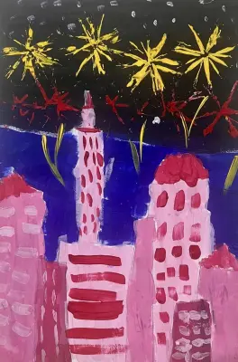 Салют рядом с центром города в честь праздника "День города" в Москве, который будет отмечаться 13 и 14 сентября 2025 года. Рисунок выполнен на листе А3 акварельными красками.