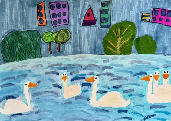 На картине изображен Пенягинский пруд в Митинском Ландшафтном парке. В пруду живет много лебедей и мне нравится гулять в парке и любоваться этими красивыми птицами.