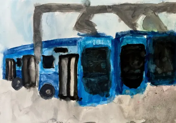 На картине нарисовано депо электробусов. Я была там на экскурсии и это было очень интересно посмотреть как заряжаются электробусы. Их очень много и к каждому подключается зарядное устройство.