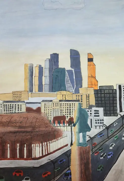 Леня - не обычный, у него аутизм и сколиоз. Он очень любит рисовать Москву, для него творчество - это способ познания мира возможность передать свои чувства. Рисуя эту работу, Лёня хотел отобразить как история гармонично переплетается с будущим.