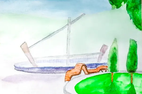 Я часто гуляю с семьёй по Черноморскому бульвару. Фонтан - мое любимое место. Он выполнен в виде корабля с парусом из струй воды и напоминает о море. Поэтому мне захотелось его нарисовать.