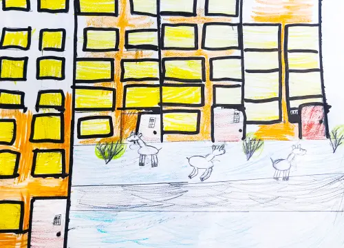 На моей картине нарисованы козочки, которые гуляют по району Южное Бутово города Москвы. Они очень ласковые и добрые, поэтому я захотела их нарисовать. Также я нарисовала дома этого района, он очень красивый, зелёный и со своими знаменитыми козочками.