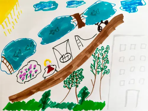 В нашей деревне есть все: и качели, и карусели, площадки с каруселями, велосипедные дорожки, по которым можно кататься и на самокате, на гироскутере. Есть пруды с рыбой.