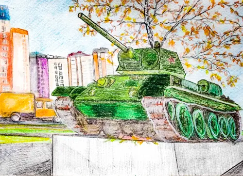Я изобразила памятник танку карандашами.