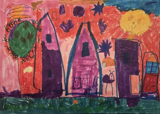На рисунке мой любимый город, район, в котором я живу, мой дом. Рядом с домом у нас много деревьев, я люблю гулять в парке в солнечную погоду с родителями.